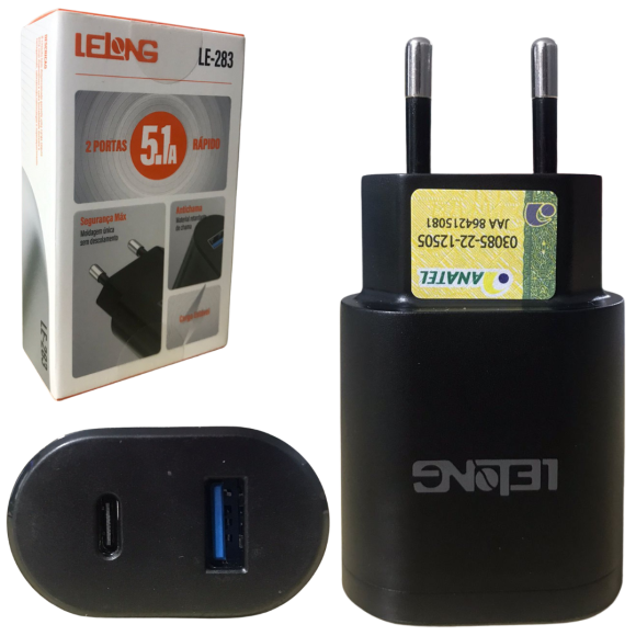 CARREGADOR COM ENTRADA USB/TIPO C 5.A - LE-283